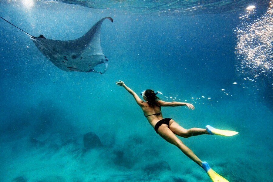 Сегодня мы наблюдаем за огромными скатами-манта! Манта достигают до 9 метров в ширину и питаются планктоном. Они совсем не опасны для человека и тоже очень пугливы. Если нам крупно повезет, то мы увидим их несколько десятков сразу!